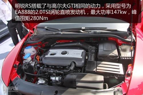 明銳RS搭載了與高爾夫GTI相同的發動機和變速箱,動力上采用EA888系列的2.0TSI渦輪直噴發動機,最大功率147kw,峰值扭矩280Nm,同樣匹配型號為DQ250的六速DSG雙離合變速器,這一動力組合用在高爾夫GTI上的加速成績為7.1秒。