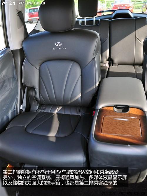 2011款英菲尼迪QX56的車身尺寸十分夸張,車長5290mm寬2030mm高1935mm,軸距達到3075mm,所以空間和舒適性絕對不是問題。即使是第二排乘客也擁有極高的乘坐感受,獨立空調、座椅通風、中央扶手箱都是后排獨享的配置。