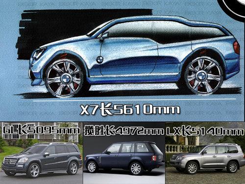 我們目前所獲得的X7的圖片僅僅是寶馬官方草圖和假象圖,不過這對于車型的未來展望已經足夠了。寶馬X7將會基于成熟的X5平臺并且做一定修改,車身尺寸方面會比X5長760mm左右,那就是達到了驚人的5610mm。要知道目前最新款的奔馳GL550的車長不過才5095mm,寶馬X7全面超越奔馳GL級算得上是真正意義上的全尺寸SUV。