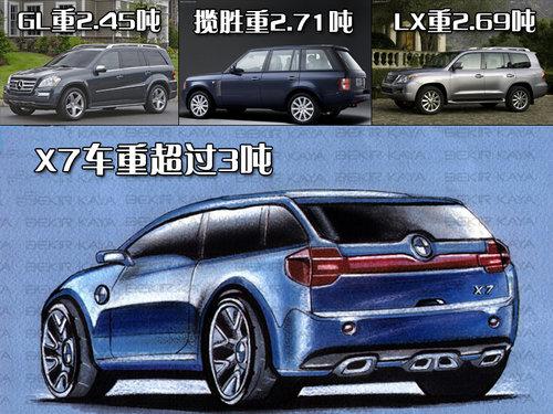 寶馬X7預計車重將超過3噸,同等級的競爭對手奔馳GL550整備質量僅為2.5噸不到。如此看來GL級在寶馬X7面前也算是小弟了。據稱寶馬X7會融合X5和7系的多項設計元素,將X5的高性能越野能力和7系的豪華裝備完美結合。X7內部空間會設置三排座椅,保證所有乘客都擁有極好的舒適性,而不是市面上一些SUV所謂的“假三排”。它的行李廂也是一大亮點,容積可能達到3000升左右,奔馳GL550的這一數據是2300升。