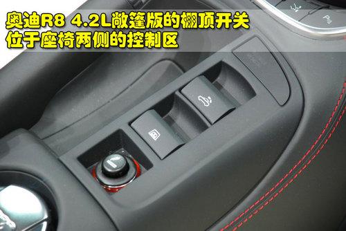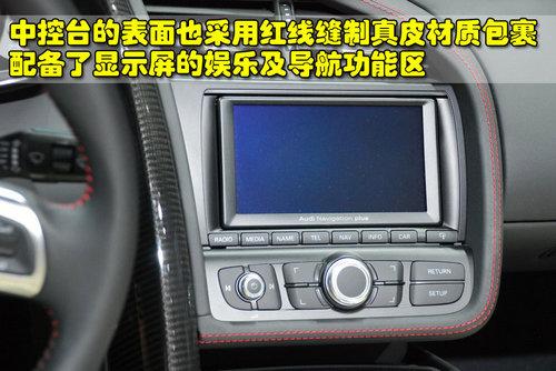 奧迪R8 4.2L敞篷版的中控臺(tái)周?chē)疾捎谜嫫ぐ⑶壹t線縫制顯得運(yùn)動(dòng)感更強(qiáng)。中控臺(tái)兩側(cè)都采用了輕量化碳纖維裝飾板。中控臺(tái)頂部配備了大尺寸顯示屏,娛樂(lè)功能和導(dǎo)航功能都一應(yīng)俱全。奧迪R8 4.2L敞篷版的頂棚開(kāi)關(guān)位于中央扶手前的位置,獨(dú)立的設(shè)計(jì)方便方便駕駛員或操作。