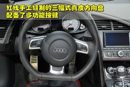 奧迪R8 4.2L敞篷版采用的是紅線手工縫制的三幅式真皮方向盤(pán),并且配備了多功能按鍵。儀表盤(pán)的布局與5.2L車(chē)型并沒(méi)有太多變化,但由于引擎動(dòng)力的減弱,轉(zhuǎn)速表的紅線區(qū)標(biāo)定為相對(duì)比較保守的8000轉(zhuǎn)。