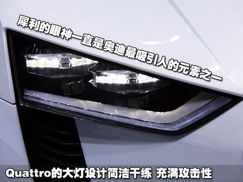 奧迪Quattro概念車的車燈看起來與家族其他車型有點相似,但仔細觀察也能看出不少不同。奧迪Quattro概念車的前燈并未采用多鍍鉻條式設計,簡單的四邊形車燈搭配兩個角度略有不同的車燈,構成了這一雙炯炯有神的眼睛,而且是一雙充滿攻擊性的眼睛。