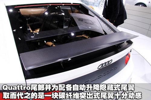 車尾部奧迪Quattro概念車除了車漆意外,基本全部被碳纖維包裹,甚至武裝到了排氣尾喉上,全碳纖維后保險杠的風格讓車輛的運動感瞬間提升了一個檔次。