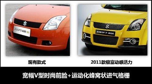 2011款雨燕在外型上與現款車型相比有了很大突破,甚至能夠稱之為運動款,運動元素遍布整個車身。前大燈、霧燈裝飾、前保險杠、進氣格柵均進行了重新設計。前臉上巨大的進氣口和黑底的前大燈顯得酷勁十足且更具侵略性;霧燈區域的變化也很搶眼,原本與條紋格柵相一致的黑色霧燈經過銀色裝飾后,視覺沖擊力更強。車身側面增加了空氣動力學側圍裙邊,動感魅力更加明顯。