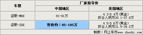 謳歌SUV車型MDX和謳歌跨界車ZDX同屬于一個(gè)級別的車型,它們的軸距都是2750mm。但是謳歌ZDX的車身要比MDX長,而身高度則低于MDX,這樣的設(shè)計(jì)完全符合跨界車(運(yùn)動(dòng)型多功能跑車)的定位。目前謳歌MDX在中國地區(qū)的售價(jià)為81-91萬,通過謳歌MDX在美國地區(qū)的售價(jià),我們預(yù)計(jì)謳歌ZDX引入中國地區(qū)的售價(jià)約為85-105萬(謳歌ZDX目前美國地區(qū)的指導(dǎo)價(jià)為4.5-5.6萬美金,折合人民幣為31.5-39.2萬元)。