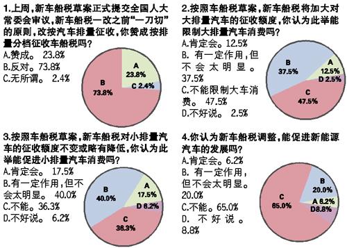 對于車船稅的這種調整方向,廣大消費者是如何看待的呢?上周,本報聯合新浪汽車對此進行了調查,結果顯示,多數讀者表示:贊成車船稅改變“一刀切”的簡單征稅模式而進行這種更趨向公平的改革,但認為“不是按價格而是按排量劃分檔次征收,仍然顯得不太合理”。在調查中,有73.8%的消費者持這個觀點,另外還有2.4%的消費者棄權,只有23.8%的消費者表示贊成。