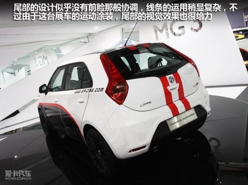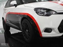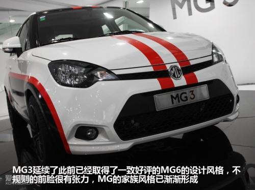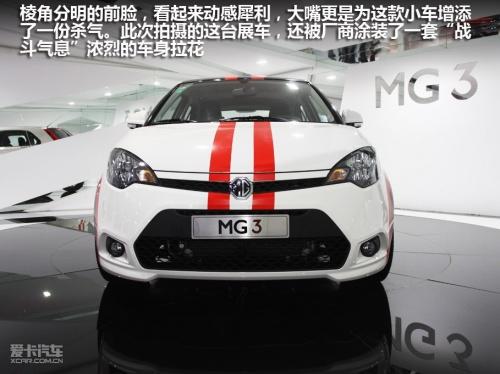 此次拍攝的這臺展車,經(jīng)過了廠家的輕度改裝。主要是“身披”了一套戰(zhàn)斗風(fēng)格非常濃烈的車身拉花,以及4個黑色的賽車競技風(fēng)格輪轂,其余部分與量產(chǎn)車型無異。外觀經(jīng)過精心改造的MG3愈顯有型,是一臺非常火辣的運(yùn)動型A0級小車。從前臉可以看出,MG3與MG6風(fēng)格十分相似,顯然MG品牌已經(jīng)找到了屬于自己獨特的家族風(fēng)格。