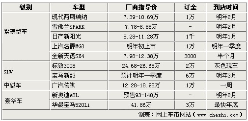 本屆廣州車展上市新車并不比北京車展多,但是所上車型基本都屬于重量級產(chǎn)品。據(jù)各廠家經(jīng)銷商銷售人員表示,十款新車大部分目前都已經(jīng)開始接受預(yù)定,并且提車時間也都集中在2011年初的第一季度,相信喜歡這些車型的朋友們?nèi)绻鍪值脑挘F(xiàn)在就可以進行預(yù)定了。