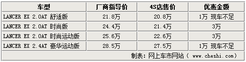 據經銷商透露,店內在售LANCER EX開始加大優惠促銷幅度。兩款優惠幅度較大的車型均有現車,且顏色較全,在原價基礎上最高優惠30000元,而需預訂的低配及高配兩款車型也有萬元的優惠,加上商家贈送免費保養或保險等,現在購買三菱LANCER EX比較超值。