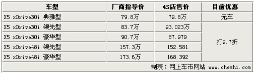 據4S店銷售人員介紹:目前寶馬X5除3.0升典雅型無車外,其它車型可打9.7折,最大優惠達5.2萬元之多。但是目前X5無現車,預定最短需等一個半月,4.8升車型最長需等半年。雖然目前X5優惠幅度較之前有所縮水,但目前無現車的狀態能有小幅優惠也算是一個小的驚喜。