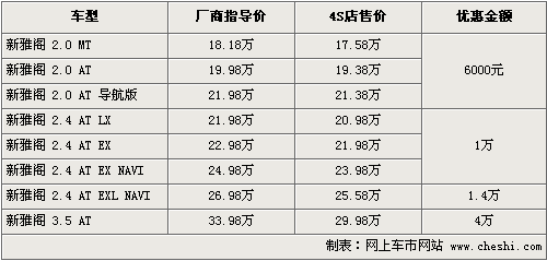 廣州本田新雅閣是中級車市場最暢銷的車型之一,也是廣州本田的旗艦車型。目前新雅閣在原來優惠基礎上,車價有一定幅度的變化,其中最高優惠幅度達到了4萬元,具體車型以及價格如下列表: