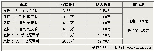 據(jù)4S店銷售人員介紹:目前速騰全系優(yōu)惠1.3萬元,較之前優(yōu)惠幅度有所增加,如在店內(nèi)做一條龍服務(wù)還可獲贈價值1000元的裝飾,裝飾主要包括腳墊、座套等。由于2.0升車型停產(chǎn),所以目前只有1.6升和1.8TSI車型。1.6升車型更注重經(jīng)濟(jì)型,而1.8TSI更加注重動力表現(xiàn)。