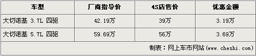 據(jù)經(jīng)銷商銷售人員介紹,大切諾基3.7L車型的優(yōu)惠金額為3.19萬元,而高排量的5.7L車型優(yōu)惠金額為3.69萬元,達(dá)到了全系的最高。在售的Jeep-大切諾基共分為3.7L四驅(qū)和5.7L四驅(qū)兩個車型。3.7L四驅(qū)型的優(yōu)惠金額經(jīng)3.19萬元的優(yōu)惠后,售價降為了39萬元。而排量稍大的5.7L四驅(qū)型的優(yōu)惠金額為3.69萬元,降價后的售價為56萬元。
