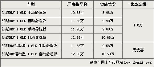 據經銷商處銷售人員介紹,別克凱越HRV已經停產,店內在售的車型只有舒適版和導航版,運動版車型已經沒有庫存車。在售的舒適版和導航版車型優惠1.6萬元,全系入門級的手動舒適版售價降到了8.98萬元。