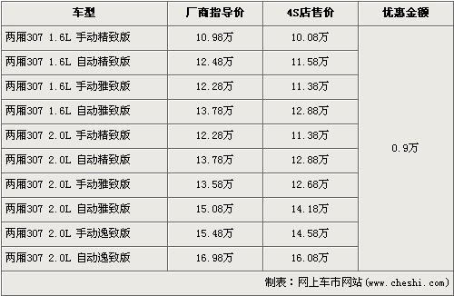據東風標致經銷店銷售人員介紹,兩廂標致307分為1.6L和2.0L兩種排量,目前全系優惠9000元,入門車型的1.6L 手動精致版原廠商指導價為10.98萬元,經優惠后僅售10.08萬元,排量稍大的2.0L排量的低配車型手動精致版經優惠后售價為11.38萬元。