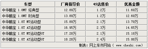 酷寶系列車型,不僅外形時尚,動力也相當充沛,不僅可與進口跑車如蓮花競速相媲美,也帶動了自主跑車市場的競爭。近期網上車市網站了解到,隨著市場競爭的加劇,現在北京的中華4S店內最高可給出24000元的現金優惠,令此車型再次引起關注。具體詳情如下: