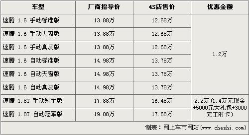 速騰是一汽大眾在緊湊型市場中的主打車型,全系車型涵蓋了1.6L、18T、2.0L三個“黃金”排量,并且在今年又會有替代2.0L車型上市的1.4T車型加入車隊中,車型列隊得到了進一步強大。近日根據網上車市價格系統監測顯示,速騰的1.8T冠軍版出現了全系最高的價值2.2萬元的優惠,具體價格詳情請看下表: