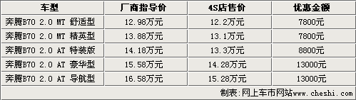 據(jù)一汽奔騰汽車4S店銷售人員介紹,目前09款奔騰B70現(xiàn)車顏色不全,主要以銀色車型為主,目前手動(dòng)擋車型只能優(yōu)惠7800元;上市不久的自動(dòng)特裝版能夠優(yōu)惠8800元;而另外兩款自動(dòng)擋車型現(xiàn)在能夠優(yōu)惠到13000元,如果到店詳談還能有更多的優(yōu)惠政策。2010款奔騰于九月十六日正式推出,售價(jià)在12.98萬(wàn)至18.88萬(wàn)元之間。