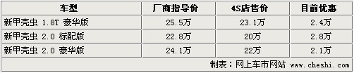 據4S店銷售人員介紹:目前甲殼蟲硬頂版本車型共有3款,1.8T車型車源較為緊張。2.0升兩款車型目前顏色較為齊全,有綠色、紅色、米色車款,可優惠2.1萬-2.8萬。1.8T車型只有天空藍顏色,且現車非常少,優惠幅度為2.4萬元。如需預定其他顏色車型,需等待1-2周時間。