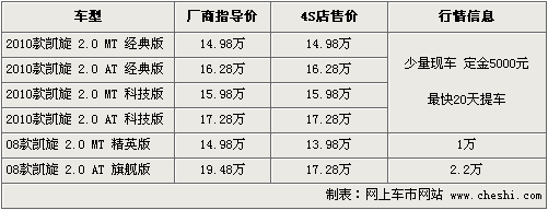 9月初,東風雪鐵龍推出了2010款凱旋,全新車型配備了大家期待已久的天窗,同時也提升了其他方面的配置,為消費者提供了非常廣闊的選擇空間。根據網上車市價格監測系統顯示,目前新款車型有少量現車,部分車型需預訂,老款最高優惠2.2萬元。詳細車型價格如下: