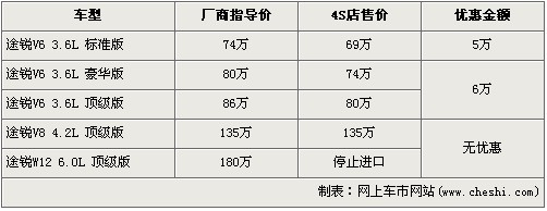 途銳是大眾首款引進我國的SUV車型,在3.6L及4.2L率先上市后,大眾為了滿足消費者的更大胃口,緊接著又推出了搭載12缸發動機的6.0L車型。隨著大排量消費稅的頒布,給9月份后入關的大排量車型帶來了一次不小的沖擊,令大排量汽車價格都上調了不少。近日據網上車市價格系統監測顯示,大眾途銳的6.0L車型已經停止進口,并且購買目前購車可以得到最高6萬元的優惠,具體詳情請看下表: