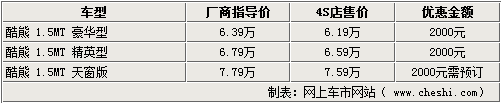 酷熊作為長城汽車在市場上推出的第三款轎車產(chǎn)品,憑借極具個(gè)性的造型和寬大的內(nèi)部空間,使很多消費(fèi)者都對其非常感興趣。新車價(jià)格分別為豪華型6.39萬元、精英型6.79萬元,天窗版7.79萬元。近日,網(wǎng)上車市網(wǎng)站了解到,長城汽車4S店處的天窗版酷熊仍然處在無車銷售的狀態(tài),其他兩款車型有現(xiàn)車銷售,可以給出2千元的優(yōu)惠。具體詳情如下: