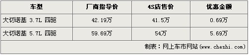 吉普大切諾基是吉普家族中極具個性的一款大尺寸車型,在推出3.7L排量車型后,消費者的選擇空間更大,同時帶給駕乘者完全不同的駕駛體驗。根據(jù)網(wǎng)上車市價格監(jiān)測系統(tǒng)顯示,目前大切諾基最高優(yōu)惠5.69萬元,具體車型以及價格如下: