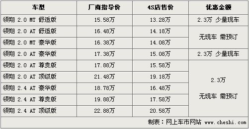 北京現(xiàn)代索納塔領(lǐng)翔于08年底正式上市銷售,為了提高領(lǐng)翔在同級(jí)別車型中的競(jìng)爭(zhēng)力,在原有車型基礎(chǔ)上,領(lǐng)翔又新增了兩款車,并提高了多款車型的配置,提高了整車性價(jià)比。根據(jù)網(wǎng)上車市價(jià)格監(jiān)測(cè)系統(tǒng)顯示,目前領(lǐng)翔全系優(yōu)惠進(jìn)一步增加,最高可優(yōu)惠現(xiàn)金2.3萬(wàn)元。具體行情如下: