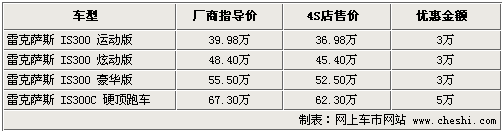據(jù)4S店銷售人員介紹,目前雷克薩斯IS300供應(yīng)的車型均為2010款,新款車型比老款增加了諸多配置,性價比更高。同時現(xiàn)車方面,入門級和炫動版車型的現(xiàn)金優(yōu)惠為3萬元,豪華版暫時沒有現(xiàn)車,需要預(yù)訂。硬頂敞篷跑車IS300C的優(yōu)惠幅度則達到了5萬元。