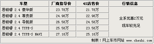 東風本田旗下的首款運動中高級車型——思鉑睿于09年9月初上市,全系共計五款車型,售價為23.78萬元—27.18萬元。上根據網上車市價格監測系統顯示,目前購買思鉑睿全系可優惠現金2萬元,現車方面較為齊全。具體車型行情如下: