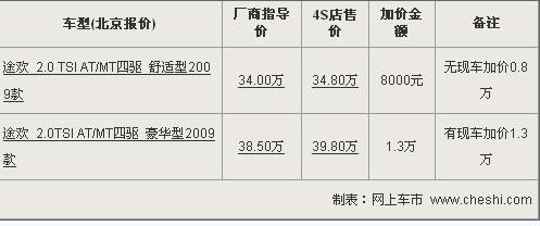 在途觀面前,Tiguan顯得有些復雜。進口大眾官方自Tiguan上市以來共推出2款車型,分別為舒適版與豪華版。Tiguan舒適版指導價為34萬,豪華版指導價為38.5萬。但在北京各4S店處,售價均上漲為34.8萬、39.8萬,兩款車分別比指導價高出8000元-13000元不等。Tiguan舒適版目前各店均無現車銷售,如預訂最快需等到4月底;而豪華版車型4S店有少量現車,且最高可在39.8萬元的基礎上優惠1萬元,最低售價38.8萬元。顏色不是非常齊全,各店現車情況有所不同。