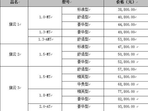 整合后的旗云品牌將面對(duì)大眾消費(fèi)者,以“務(wù)實(shí)、家庭、信賴”為品牌內(nèi)涵,為消費(fèi)者提供可以輕松擁有、值得信賴的汽車產(chǎn)品,現(xiàn)階段主要包括旗云1、旗云2和旗云3三款產(chǎn)品,分別在A0級(jí)、A級(jí)、A+級(jí)三大市場(chǎng)中豎立“空間、節(jié)能、性價(jià)比”新標(biāo)桿。同時(shí)在未來,旗云品牌將進(jìn)一步豐富產(chǎn)品線和品牌內(nèi)涵,從而滿足國內(nèi)汽車市場(chǎng)差異化的需求。