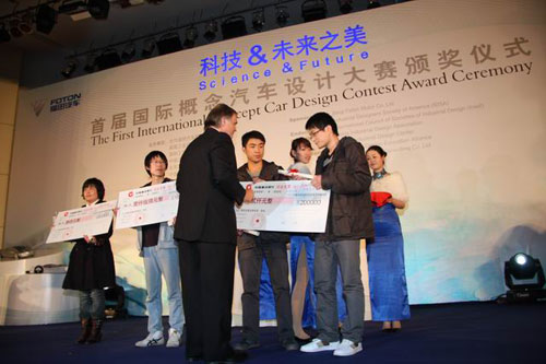 中新網4月29日電 日前,2010北京國際車展前一天,一場融匯了設計與科技的盛宴提前上演。主題為“科技&未來之美”的首屆國際概念車設計大賽,在福田汽車隆重舉行了頒獎儀式。國際工業設計聯合會主席Carlos Hinrichsen、美國工業設計師協會執行董事克萊夫•魯、福田汽車總經理王金玉、清華大學美術學院博士生導師柳冠中等領導和專家出席了頒獎儀式,來自全國各地的120多家新聞媒體記者也來到頒獎現場。本次大賽共決出了“最佳和諧美感獎”、“最佳創意未來獎”、“最佳前沿科技獎”三類單項獎,以及“最具人氣獎”和“最佳組織獎”等獎項,而本次大賽最高獎項“全場大獎”被來自山東省工藝美術學院的王炎超、張知真奪得。