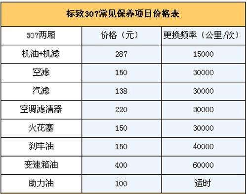 5.保養(yǎng)費(fèi): 我們向標(biāo)致4S店售后服務(wù)人員咨詢過,他們說307一大優(yōu)勢是保養(yǎng)周期比較長,1.5萬公里才需要保養(yǎng)一次,是同級(jí)車型中保養(yǎng)花費(fèi)最低的。通常新車首保在7500公里時(shí)進(jìn)行,以后每1.5公里保養(yǎng)一次。第二次1.5萬公里時(shí)的常規(guī)保養(yǎng)(更換機(jī)油機(jī)濾)需花費(fèi)287元;3萬公里保養(yǎng)(更換機(jī)油機(jī)濾+空濾+空調(diào)濾芯+汽濾+火花塞)為795元;4.5萬公里保養(yǎng)(更換機(jī)油機(jī)濾)花費(fèi)287元;6萬公里保養(yǎng)(更換機(jī)油機(jī)濾+空濾+空調(diào)濾芯+汽濾+火花塞)為795元。