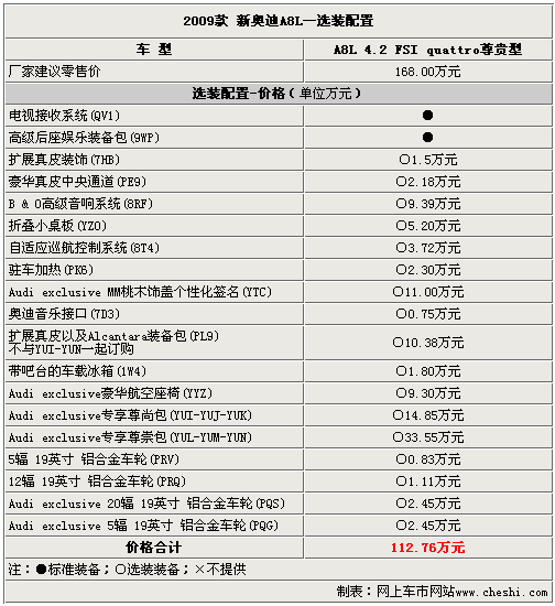 以上的選裝配置需要在預訂車輛前選擇好,經銷商會根據客戶的訂單向廠家發送配置代碼。09款奧迪A8L的選裝配置十分豐富,完全可以滿足對配置有需求消費者的“苛刻”要求。當然,這些配置也需要不菲的金錢才可以擁有,究竟哪些配置適合有品位懂得享受的您呢?