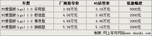據比亞迪汽車4S店銷售人員介紹,比亞迪F0愛國版igo系列車型的現車并不是很齊全,實用型和舒適型都有現車,尊貴型和旗艦型則需要預訂,大概10-15天即可提車。而目前1.0L實用型和舒適型都有現車,其中實用型可以優惠5000元,而其他車型只可以優惠2000元現金。