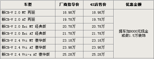 據(jù)4S店銷售人員介紹,目前購買本田CR-V仍需要加價提車,需要加現(xiàn)金8000元或者加1.5萬元的全車裝飾,裝飾包括了腳墊、尾翼、行李架、踏板等。消費者可根據(jù)需求選購,但是必須達(dá)到1.5萬元的消費金額。目前2.0和2.4自動檔有黑色、銀色現(xiàn)車供應(yīng),其他特殊顏色還需要預(yù)定。