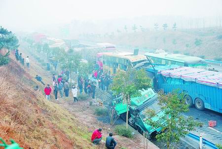 前天上午9時許,滬陜高速商城至固始段突起大霧,該路段商城服務區東800米處10余輛汽車發生連環相撞,造成1人死亡。