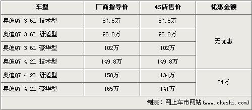 Q7是奧迪打造的第一款“高性能SUV”,同時也是奧迪引進中國的第一款頂級SUV車型。Q7憑借杰出的運動性、高超的操控性及沖擊性極強的外形在上市時就獲得了人們的關注。隨著在上海車展亮相的改款新Q7即將上市,在售的老款Q7已經(jīng)停產。目前在售的奧迪Q7出現(xiàn)了最高為24萬元的優(yōu)惠,具體詳情請看下表: