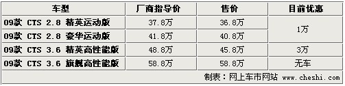 據4S店銷售人員介紹:目前在售的凱迪拉克09款CTS共有2.8L和3.6L兩個排量車型。這4款車型目前優惠幅度較小,最高優惠3萬元。2.8L車型目前優惠1萬元,3.6升精英版優惠3萬元,頂配車型無現車。由于CTS在凱迪拉克系列中不是主打車型,所以優惠幅度較小,也與其進口車型有關。如果您對此款車感興趣,請及時與店內聯系。