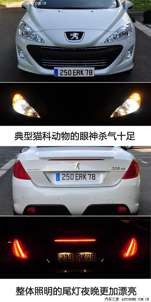 巨大的獅子標致凸顯在前鼻翼的頂部,這也是新一代標致車型的特點之一。308CC擁有著外凸的大燈和207CC非常相似和前部線條以及明顯加寬處理的前翼子板相配合確實有些獅子的威嚴和兇猛,這也是新一代標致車型的另一個家族式特點,308CC采用了階梯式的組合,高配車型還增加了氙氣大燈,彎道輔助照明、日間新車大燈,相比上一代車型大大增加了行車安全。