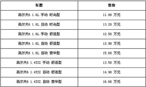 一汽大眾第六代高爾夫大眾第六代高爾夫19日在長春一汽大眾二廠總裝車間內上市。此次上市的車型包括三款1.6L車型、二款1.4T車型,售價區間為:11.88-16.68萬元。具體價格表如下: