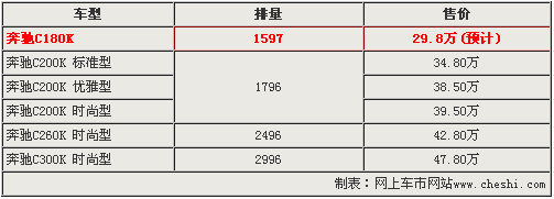 目前,北京奔馳新C級轎車共有3個排量五款車型,而入門級車型奔馳新C200K 標(biāo)準(zhǔn)型的售價為34.8萬元。由于奔馳新C200K 標(biāo)準(zhǔn)型在經(jīng)銷商處可以優(yōu)惠2萬元左右,所以奔馳新C180K車型作為奔馳新車的入門車型,預(yù)計售價為29.8萬元。同時,與售價分別為28.3萬和29.1萬的寶馬318i和奧迪A4L1.8T形成真正的抗衡。