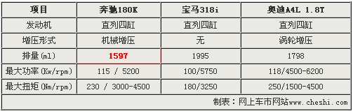 奔馳新C180K車型雖然僅搭載1.6升排量引擎,但其最大功率和扭矩卻高達(dá)115Kw/5200和230Nm/3000-4500,較排量為2.0升的寶馬318i分別高出15 Kw和50 Nm。由于奧迪A4L 1.8T搭載了1.8升燃油直噴渦輪增壓引擎,所以最大功率和扭矩位居三款入門級車型之首。