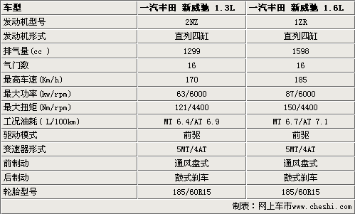 豐田新威馳將繼續(xù)搭載1.3L和1.6L兩款發(fā)動機,來滿足不同消費者的需求。這兩款發(fā)動機都是直列4缸16氣門引擎,具有可變節(jié)氣門技術(shù),在保證強勁動力輸出的同時,又可以達到了良好的節(jié)油性能,1.6L自動擋車型的百公里油耗僅為7.1L,1.3L手動擋車型的油耗更為節(jié)省,百公里油耗不到6.4L。在動力輸出方面,1.3車型的最大功率和最大扭矩分別達到了6.3Kw和121Nm,同時1.6車型的最大動力輸出也達到了87Kw和150Nm。在同級車中絕對稱得上是出類拔萃。在變速器方面,分別裝配上了5速手動變速器和4速手自一體變速器。新威馳的制動器均為前盤后鼓式制動器。