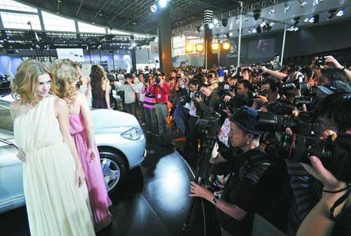 網友“午夜鐘聲”正在奔馳展位上尋找著最合適的拍攝位置,“去年奔馳展位上的洋車模最為出彩,今天肯定要來看一看。”他9點就來到車展主會場,帶著全套攝影裝備,一個小時收獲了300多張照片,“回去整理好就貼我的博客上去!彼d沖沖地說。