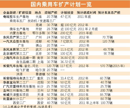 如此龐大的產(chǎn)能擴(kuò)充計(jì)劃讓相關(guān)各方憂心忡忡。今年年初,工信部向國內(nèi)車企下發(fā)了《關(guān)于調(diào)查汽車生產(chǎn)企業(yè)投資項(xiàng)目有關(guān)情況的通知》,通知要求車企上報(bào)現(xiàn)有產(chǎn)能情況和2010年~2015年產(chǎn)能規(guī)劃和投資情況。市場的火爆讓“產(chǎn)能過剩”的憂患呼聲逐漸熄滅,對部分廠家而言,最核心的任務(wù)仍然是增加產(chǎn)能。
