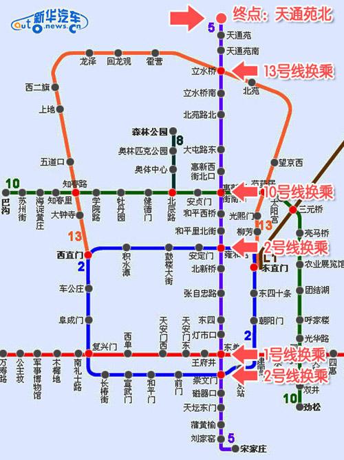 車展專線1號線的始發(fā)站是地鐵5號線的終點站,天通苑北站。家住天通苑北的同志們上班遠(yuǎn)一點,可是看車展就比較方便了。乘坐地鐵的換乘路線如下圖所示: