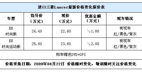 筆者近日從北京港龍基業(yè)經(jīng)銷商處獲悉,進(jìn)口三菱Lancer EX車型保持著最高2萬元的優(yōu)惠,并且近期購車還將獲贈(zèng)DVD+GPS,現(xiàn)時(shí)尚型和時(shí)尚運(yùn)動(dòng)型現(xiàn)車充足,紅,黑,紫灰等常見顏色均有現(xiàn)車,感興趣的朋友可以與經(jīng)銷商聯(lián)系,詳細(xì)價(jià)格信息請(qǐng)見下表: